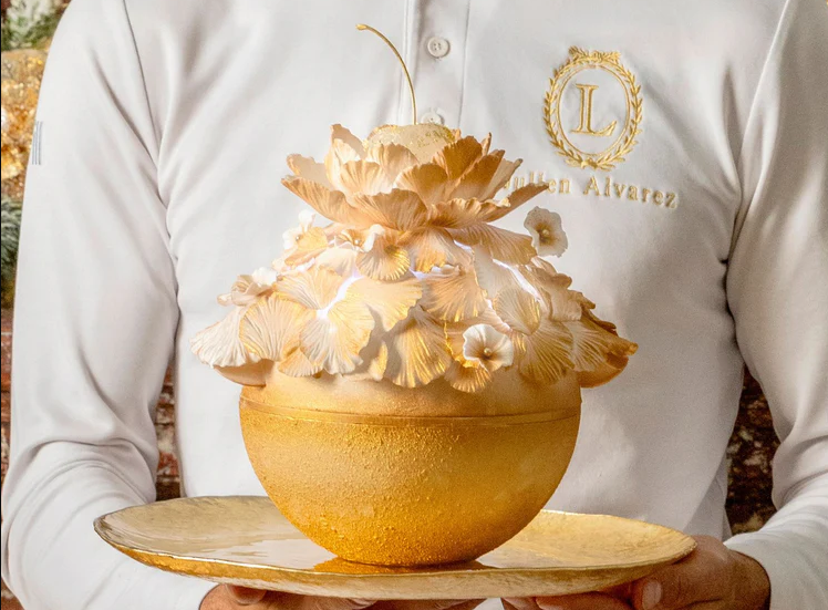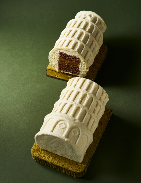 La mythique Tour de Pise à l’équilibre instable a, elle, donné des idées à Jeffrey Cagnes qui a imaginé une réplique confondante de réalisme avec sa coque en chocolat blanc qui restitue avec finesse les arcades et les moulures. A l’intérieur de cette création architecturale, un gourmand biscuit cuillère avec chocolat, café et mascarpone aux accents italiens qui évoquent le tiramisu.
