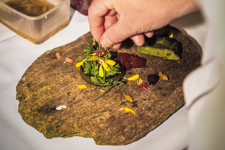 Au lac de Saint Andéol, près du pont de Marchastel ou vers la cascade de Déroc, David Burgarella pêche la truite, le sandre ou le goujon, qu’il met ensuite à son menu. Aux branches des sapins, il cueille des bourgeons pour en faire des pickles. Dans les fourrés, ce sont les mûres qu’il récolte pour les travailler elles-aussi dans ses plats. La viande qui mature – sans excès – dans son garde-manger vient bien évidemment des plateaux de l’Aubrac et lorsqu’il sert l’incontournable Farçou – la galette de blettes et de persil typique de l’Aveyron – il la transforme en une ode à ces pérégrinations en altitude. Une salade d’herbes, un sorbet au persil, une crème de blettes, les bourgeons de sapin et les mûres à l’aigre-doux viennent embrasser le palet tout juste poêlé, le tout posé sur une lauze anthracite.