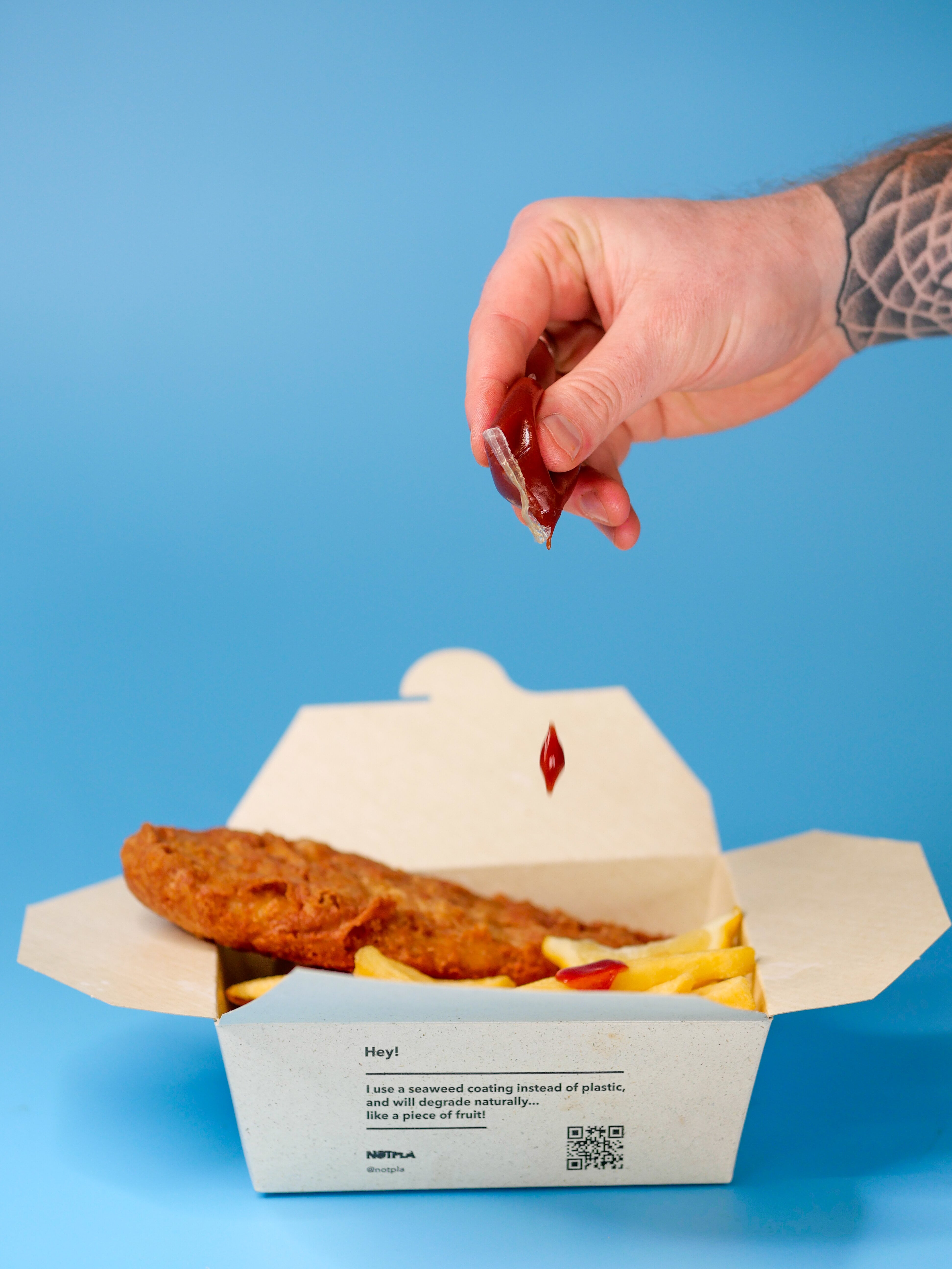 L'épidémie de Covid-19 a également été un vecteur d'accélération concernant l'avenir des emballages de plats à emporter. La majorité est certes, recyclable, mais beaucoup d'emballages carton sont revêtus d'une fine pellicule de plastique qui, elle, ne se recycle pas dans ce cas précis. Notpla s'est donc penché sur le sujet via leur star Ooho évidemment : Ooho n'est plus uniquement destinée à hydrater les coureurs téméraires, mais peut également servir de sachets de sauces, d'alternative aux bouteilles d'alcool... Mais les emballages de nourriture quant à eux sont également fabriqués de manière biodégradable par l'entreprise : la pellicule de protection n'est donc pas faite de plastique mais toujours à partir d'algues, pour assurer sa disparition à 100%.