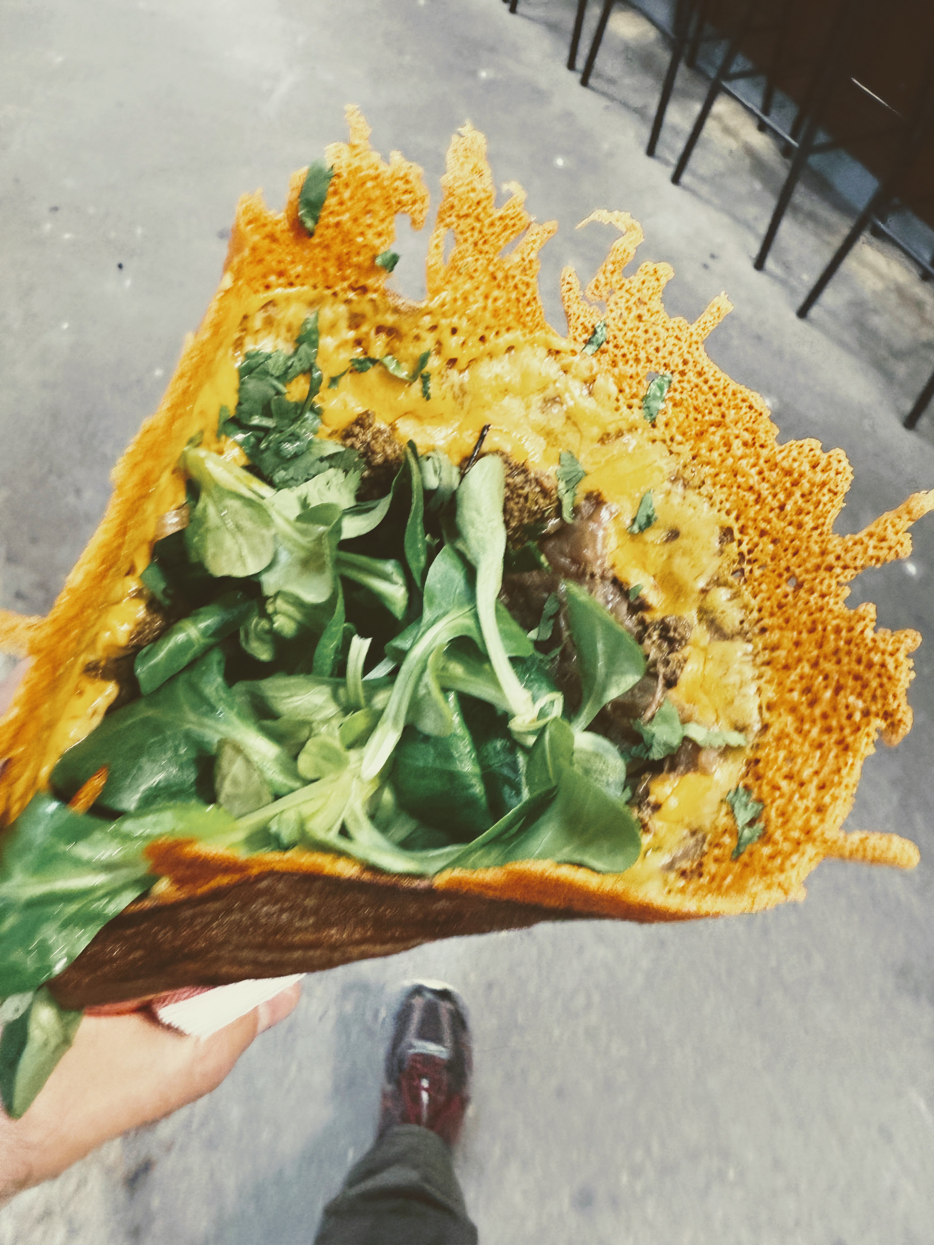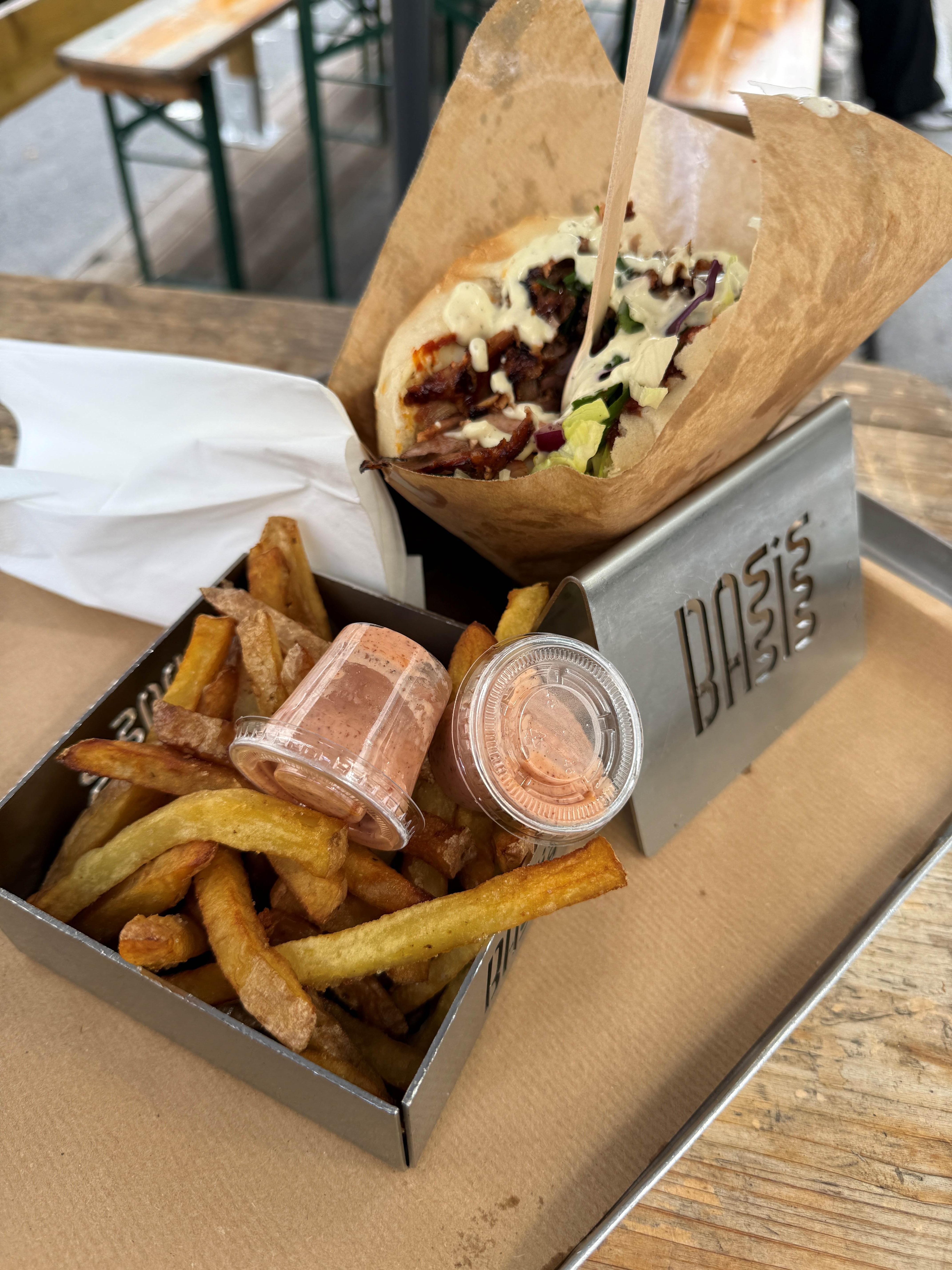 N’en déplaise aux plus diététiques d’entre nous, mais il est impossible de parler de street-food sans mentionner le kebab. Mais attention, on ne parle pas ici d’un kebab sorti de nulle part, bien au contraire. Celui de Basis, planqué dans la rue de Belleville, cette rue qui transpire le vivant à chaque angle. Ici, c'est un rituel, quasi dogmatique, en 4 étapes. Le pain d'abord. Pain rond maison — croustillant et moelleux comme un oreiller qu'on ne voudrait pas quitter le matin. Les bases sont posées. Puis la recette. Cinq au choix mais spoiler-alert : la star, c'est le Good Morning Istanbul, avec une sauce maison légèrement pimentée qui vient réveiller la barbaque et les garnitures comme un le premier rayon de soleil matinal en pleine face. Viens ensuite la viande, le moment de vérité. « A Rome, fait comme les Romains », on vous conseille l'agneau, grillé juste ce qu’il faut pour croustiller sous la dent, tout en gardant son goût franc qui claque comme une évidence. Option végane disponible – et c’est suffisamment rare pour mériter son pins. Si vous nous suivez toujours, il manque la dernière étape : les frites. Aussi longues, robustes et chaleureuses qu’une soirée d’été, amateurs d’allumettes et autres miettes de chips, tracez-votre route. Une adresse pour laquelle on lève fort le pouce bien gras post-dégustation. Bref, on approuve !