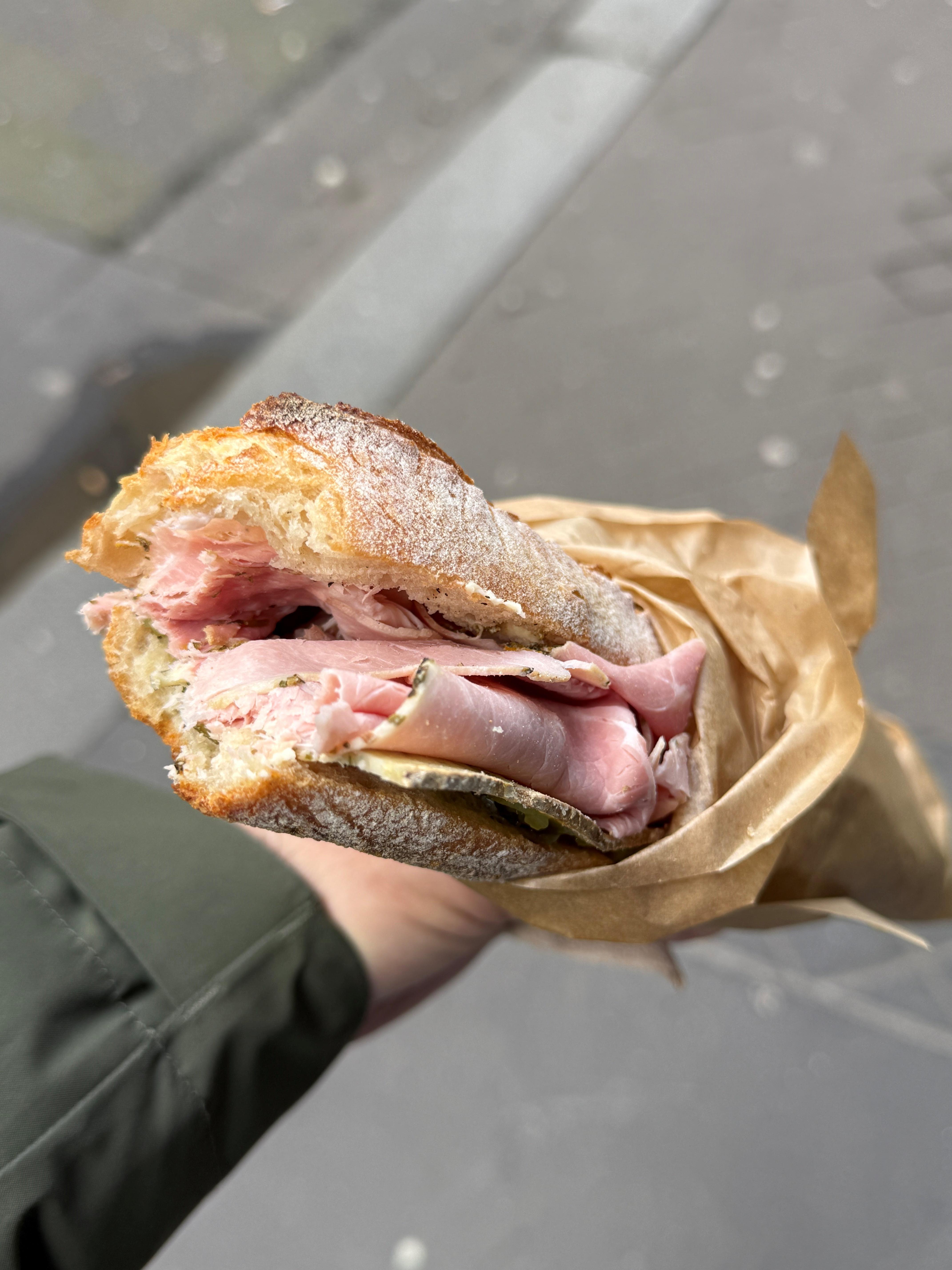 On l’oublie trop souvent, mais la France possède depuis des siècles son propre totem de la street-food. Le seul, le vrai, l’indéboulonnable jambon-beurre. Chez Le Parizot, pas de diversion, pas de pas de travers, on fonce tout droit dans le jambon-beurre, et rien d’autre. Par conséquence, il est exécuté au millimètre, avec une obsession touchante et honorable : faire simple, mais le faire mieux que tout le monde. Le jambon ? il vient de chez Doumbéa, un maître en la matière, et se décline en trois versions : classique, fumé, herbes. Le beurre ? Normand, baratte, salé, évidemment ! Un peu de poivre… et ce jour-là, petite surprise qui déboule sans prévenir : une tome à l’ail des ours qui vient câliner le jambon avec tendresse. Et puis le tremblement de terre, le truc zinzin que t’avais pas vu venir et qui te secoue jusqu’au plus profond de toi. Le confit de cornichon au poivron rouge de la maison Bornibus. Sincèrement, ça change tout. Ça fout direct une ambiance de fête de la musique dans un sandwich que tu pensais connaître par cœur. Alors respect. Le meilleur jambon-beurre de Paris ? Impossible de trancher (vous l’avez), trop de candidats en compétitions, puis les goûts et les couleurs... Mais on est clairement ici dans le haut du panier.