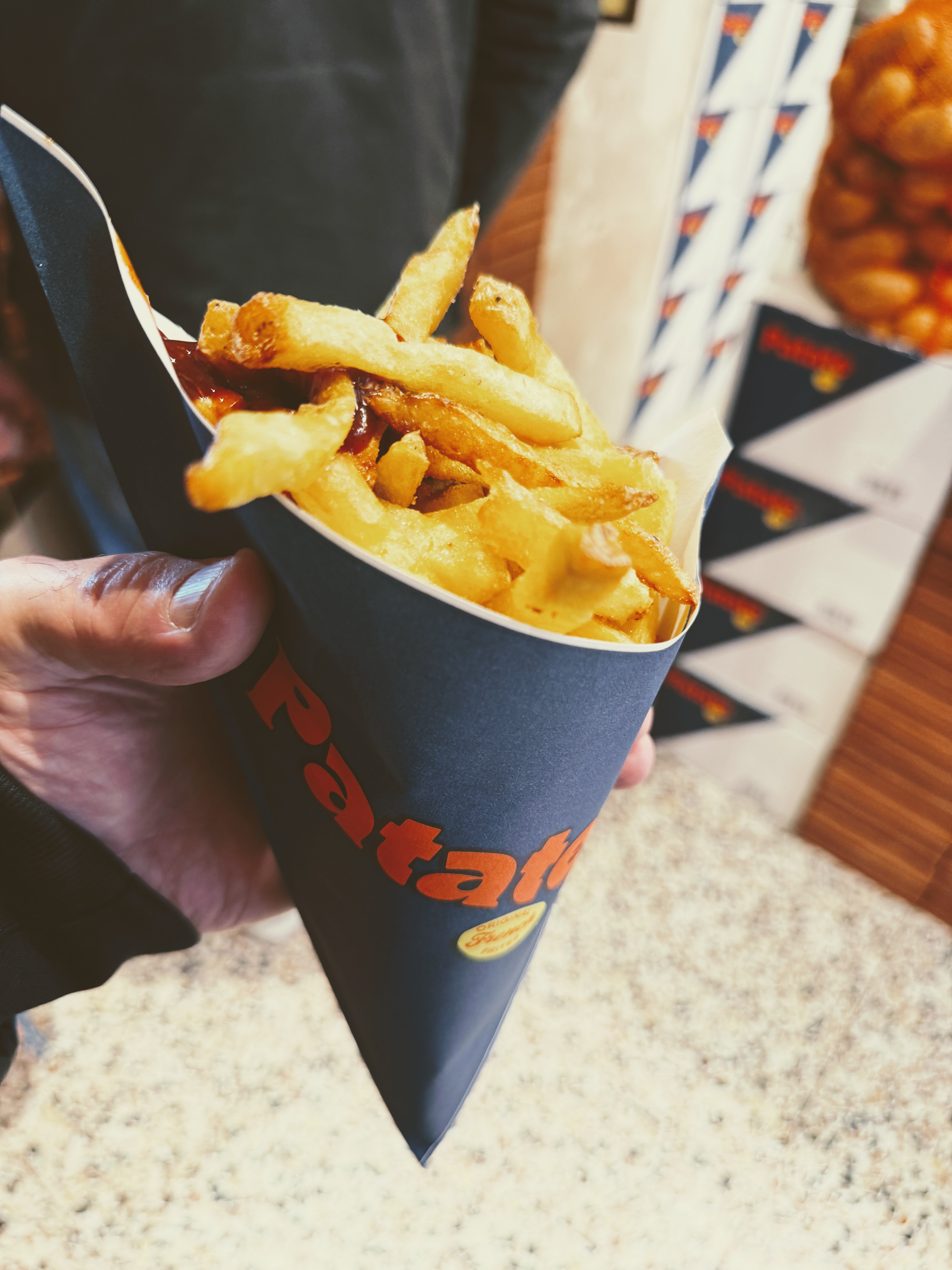 La frite, cet éternel kiff, qu’on ait 7 ou 177 ans (au moins, hygiène de vie oblige). On avait un peu oublié le concept de la friterie. On gardait, par flemmardise, cette image un peu vieillotte, un peu grassouillette, façon baraque de bord de route avec relents de mayo tiède. Erreur monumentale. Parce qu’une jeune équipe est venue dépoussiérer tout ça avec (la) Patate ! Ici, pas de grommelot. On parle de frites, point barre. Mais de vraies frites : dorées comme un coucher de soleil sur les Flandres, préparées en double cuisson bien évidemment, dans une huile… végétale. Oui oui, vegan friendly — mais surtout ultra croustillantes. Elles se dégustent nature pour les puristes ou, pour les plus fougueux, trempées dans une sauce maison (et là, le choix est vaste : des classiques, des pimpées, des petites bombes aromatiques). Servies dans un cornet dispo en trois tailles — de la fringale de 11h un peu mignonne à la grosse dalle d’ogre affamé depuis 2 jours. Et comme c’est ouvert toute la journée, on dédramatise plus facilement le cornet de frite du mercredi 15h. Après tout, dans « plaisir coupable », y’a surtout le mot « plaisir ».