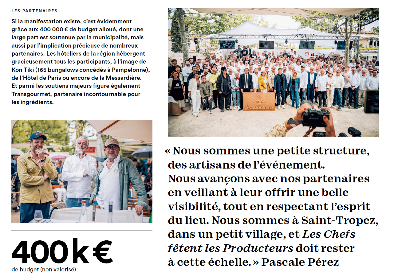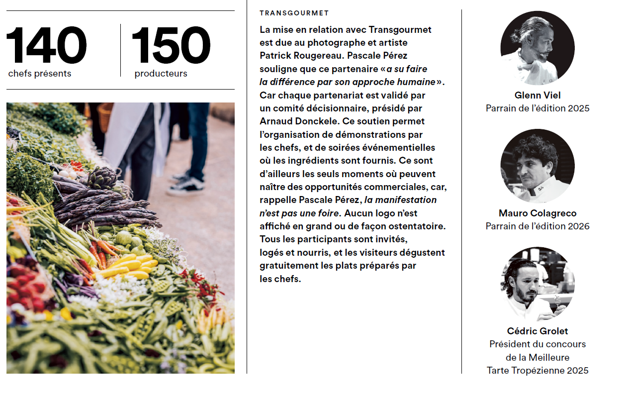 Dès la première édition, l’enthousiasme est palpable, tant chez les participants que chez les visiteurs. « Nous avons immédiatement senti qu’il se passait quelque chose de magique, que les chefs étaient détendus, l’atmosphère exceptionnelle, et les producteurs plus qu’heureux », confie Pascale Pérez. Et le cadre joue pour beaucoup : début mai, Saint-Tropez est encore épargné par le tumulte estival, et les festivités se déroulent dans une atmosphère intime, élégante, mais sans excès. « Nous avons installé nos producteurs sur des tables particulières, nappées, ombragées de parasols blancs… tout était assorti, élégant. Et les chefs locaux se sont volontiers prêtés au jeu des démonstrations », précise l’organisatrice de l’événement.